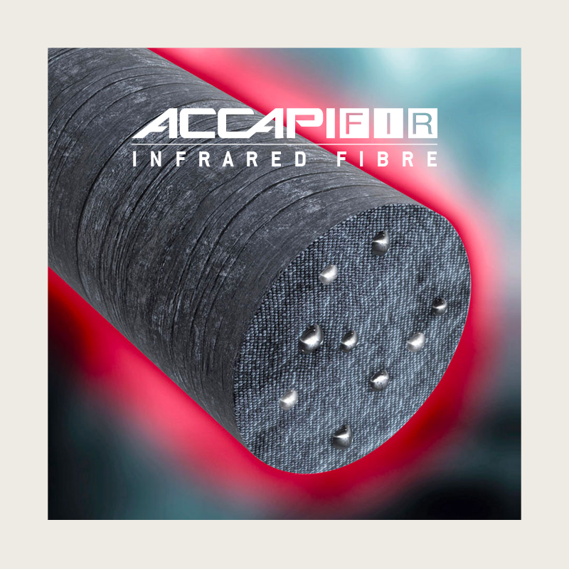 Die ACCAPI FIR Faser wird mit der Energie der IR-Strahlung im Frequenzbereich von 5-20 μm hergestellt: Die ACCAPI-FIR Faser kann die Sauerstoffzufuhr der Muskeln erhöhen, die Thermoregulation und Thermogenese optimieren, die Aufholzeit beschleunigen, den Ausstoß der Giftstoffe und Abfälle des Metabolismus fördern und dank der bakteriostatischen Wirkung die Bildung unangenehmer Gerüche verhindern.